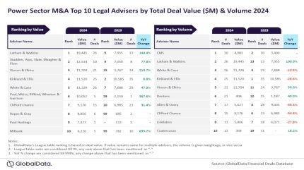 Latham & Watkins and CMS have emerged as the top mergers and acquisitions (M&A) legal advisers in the power sector for 2024 based on value and volume respectively, according to GlobalData, a data and analytics company.