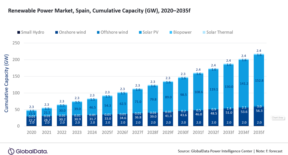 Spain is reinforcing its clean energy transition with ambitious targets for solar, wind and hydrogen, backed by strong European Union (EU) alignment and national reforms. The country aims to achieve 81% renewable electricity generation by 2030 and carbon neutrality by 2050 under its updated National Energy and Climate Plan (PNIEC). Against this backdrop, Spain’s cumulative renewable capacity is projected to reach 218.1GW in 2035, growing at a compound annual growth rate (CAGR) of 9.1% from 2024 to 2035.