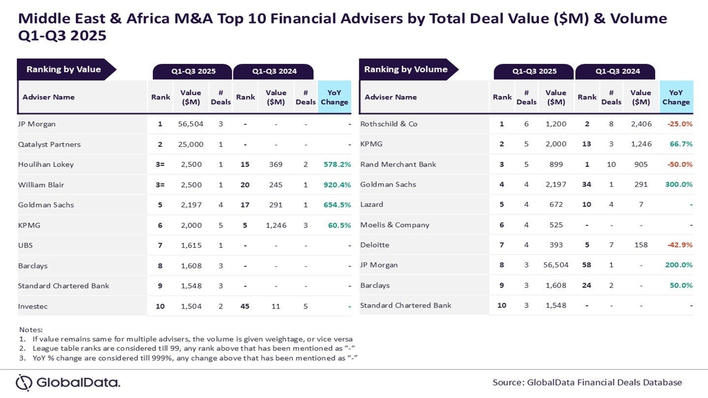 JP Morgan, Rothschild lead financial advisers of MEA region in Q1-Q3 2025