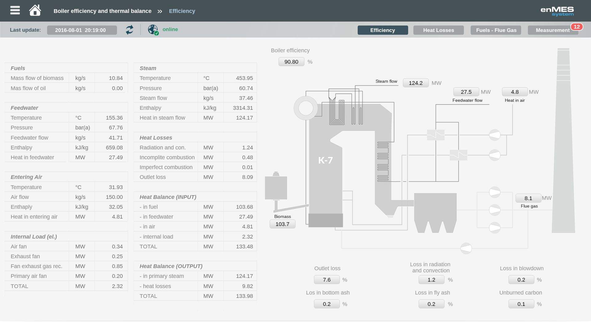The company monitors boiler efficiency and thermal balance, outlet loss and performance trends.