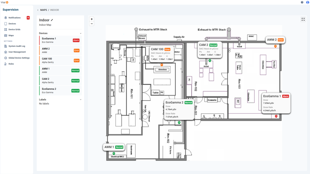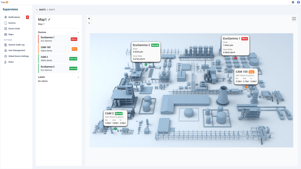 The safety impact extends beyond dose reduction to the way the platform supports situational awareness. In outage work, emergency drills, or unplanned incidents, nuclear operators often must reconcile information from multiple systems to build a coherent view of site conditions. Vital consolidates these fragments into a single, near real‑time operational picture. Alarms, alerts, and fault conditions from diverse instruments are surfaced through a common notifications dashboard that clarifies event priority, duration, and origin. Coupled with map‑based visualization and customizable device grids, this gives radiation protection and operations teams a site‑wide view of radiological conditions and instrument status at a glance, enabling quicker, more targeted responses in time‑sensitive situations.