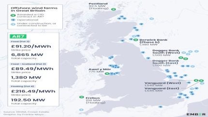 The map above shows the location and size of the new developments of fixed and floating offshore wind resulting from AR7. All the developments were agreed at a strike price of £91.20/MWh (2024 prices), except for Berwick Bank Phase b at £89.49/MWh, and Erebus and Pentland, both floating wind sites, each at £155.37/MWh.