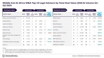 Gibson, Dunn & Crutcher and White & Case have emerged as the foremost legal advisers for mergers and acquisitions (M&A) in the Middle East & African (MEA) region for the first three quarters (Q1-Q3) of 2025 in terms of value and volume, respectively.