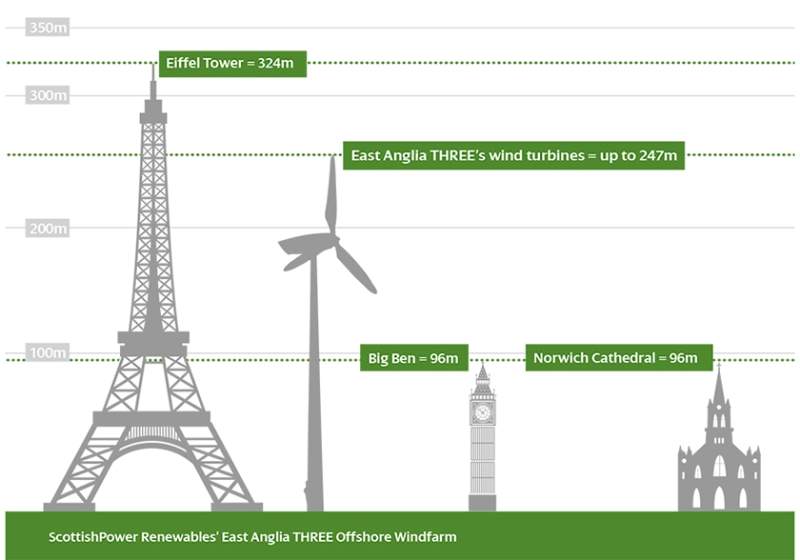 East Anglia THREE is to be developed 69km off the coast of Norfolk, East Anglia. It will be able to supply electricity equivalent to the annual energy consumption of 989,200 households.