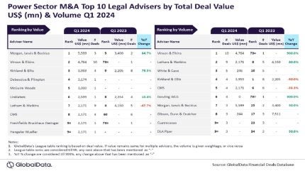 Morgan, Lewis & Bockius and Vinson & Elkins have emerged as the leading legal advisers in the power sector’s mergers and acquisitions (M&A) landscape in the first quarter of 2024, according to GlobalData’s league table.