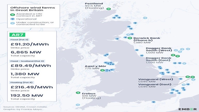 The map above shows the location and size of the new developments of fixed and floating offshore wind resulting from AR7. All the developments were agreed at a strike price of £91.20/MWh (2024 prices), except for Berwick Bank Phase b at £89.49/MWh, and Erebus and Pentland, both floating wind sites, each at £155.37/MWh.