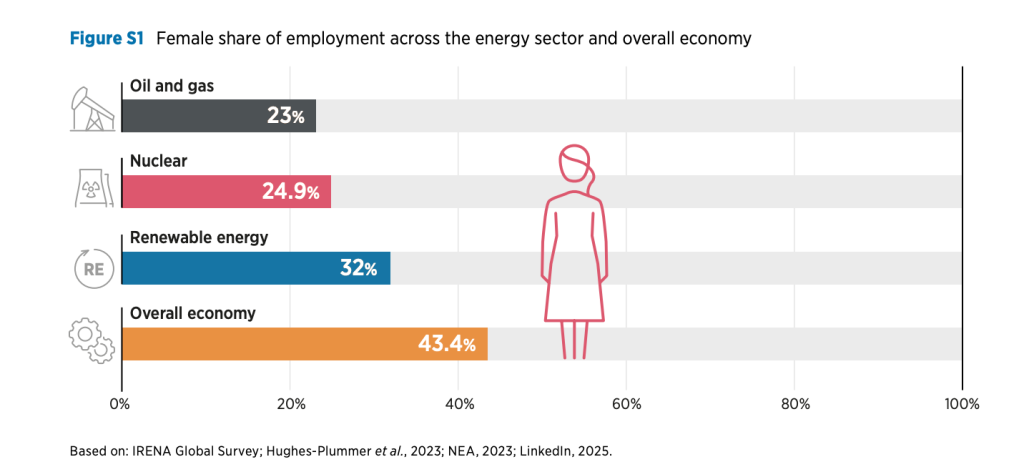 Energy: A Gender Perspective finds that women hold 32% of full-time jobs across the sector. While this figure is higher than in oil and gas and nuclear energy, it remains well below the global workforce average of 43.4%, highlighting persistent participation gaps as renewable energy deployment continues to expand worldwide.