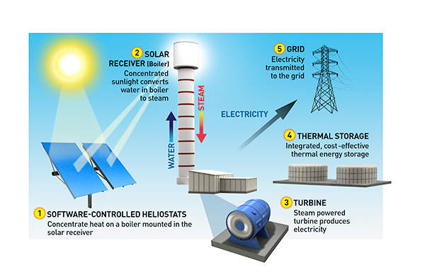 The project was expected to use approximately 360,000 software-controlled mirrors to track the sun in two dimensions and reflect sunlight to the boilers. The superheated steam produced by the boiler was anticipated to be piped to a Rankine cycle non-reheat steam turbine.